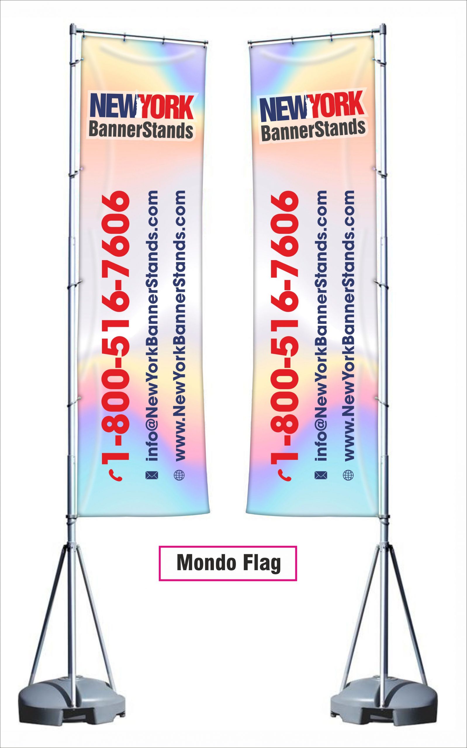 The Mondo Flagpole banner stand comes with a custom print, stand and water base. The Mondo flagpole is ideal for outdoor events, conference, sport events, etc. The banner design is customized to your graphic artwork, and is printed on a polyester-blend mesh fabric material by the process of dye sublimation. The telescopic aluminum flagpole fits into a plastic base that can be filled with water for stability. The flag is grommeted across the top and down 1 side and attaches to the flagpole with the supplied rings.