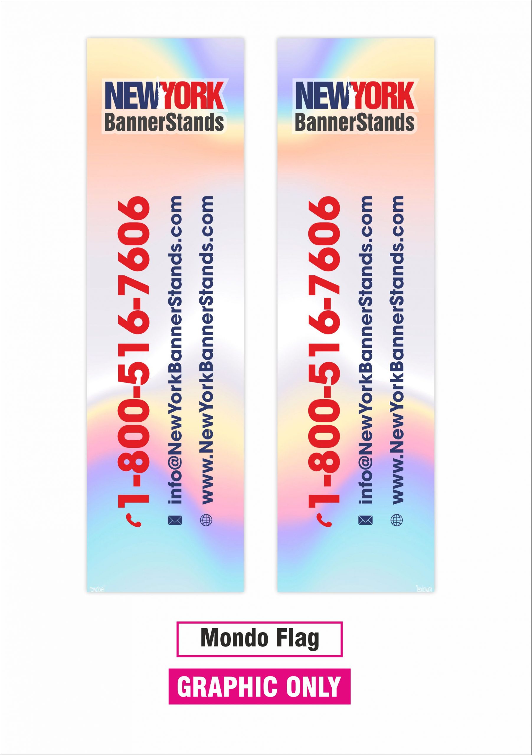 The Mondo Flagpole banner stand comes with a custom print, stand and water base. The Mondo flagpole is ideal for outdoor events, conference, sport events, etc. The banner design is customized to your graphic artwork, and is printed on a polyester-blend mesh fabric material by the process of dye sublimation. The telescopic aluminum flagpole fits into a plastic base that can be filled with water for stability. The flag is grommeted across the top and down 1 side and attaches to the flagpole with the supplied rings.