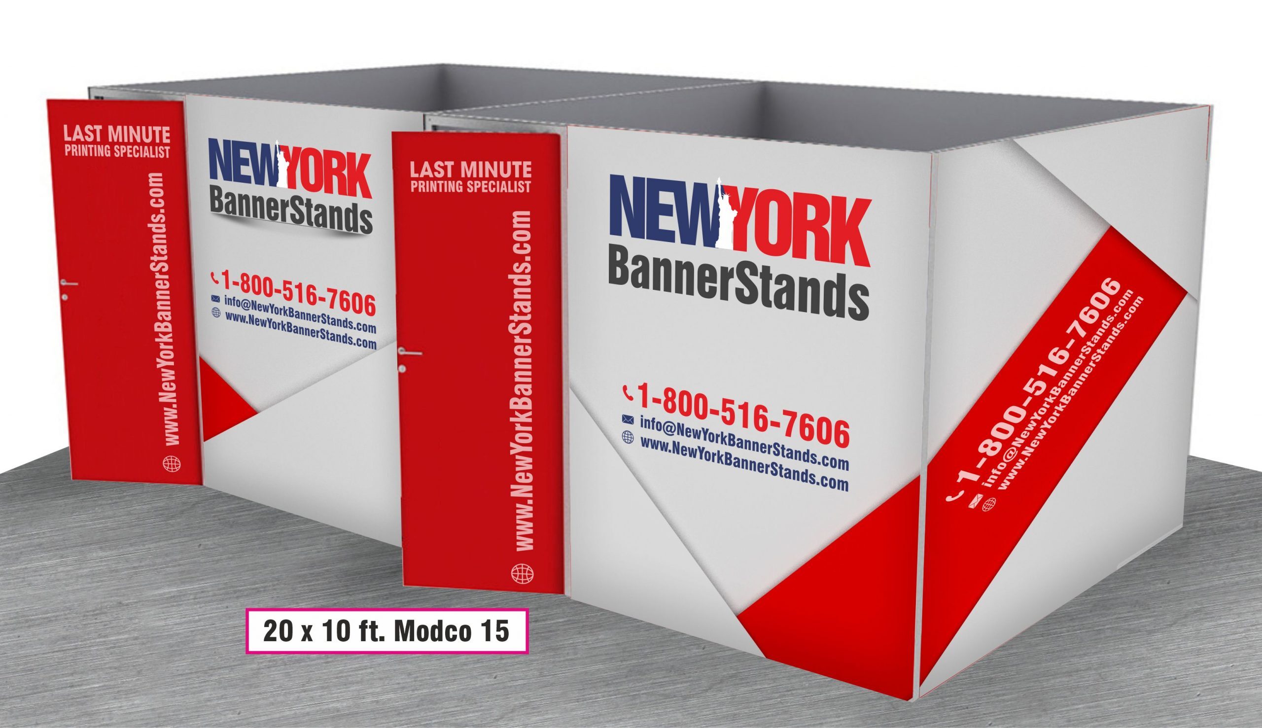 Modco Modular Display 15 is a three-dimensional 20’ x 10’ pre-designed configuration featuring two separate 10′ x 10′ exhibit rooms. Stylish and lively, these rooms are built using tool-free perforated modular aluminum frames. Multiple size frames connect using toolless pin connectors for a quick and easy build. Each rooms features a door w/ lockset and key. Perforations are completely covered for a flawless finish.