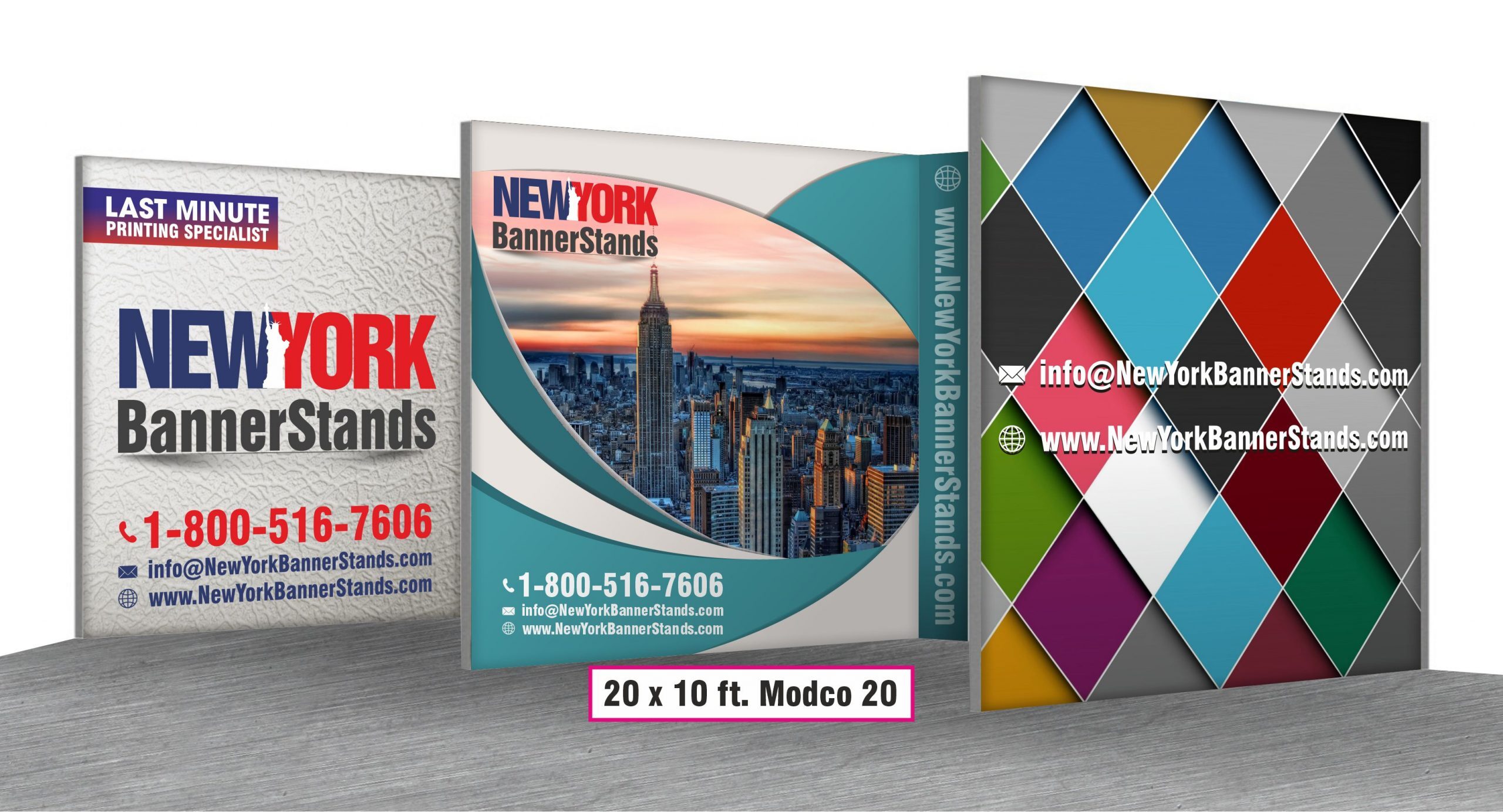 Modco Modular Display 20 is a three-dimensional 20’ x 10’ pre-designed configuration featuring two separate 10′ x 10′ exhibit rooms. Stylish and lively, these rooms are built using tool-free perforated modular aluminum frames. Multiple size frames connect using toolless pin connectors for a quick and easy build. Each rooms has an open faced front for an open entrance and displaying. Perforations are completely covered for a flawless finish