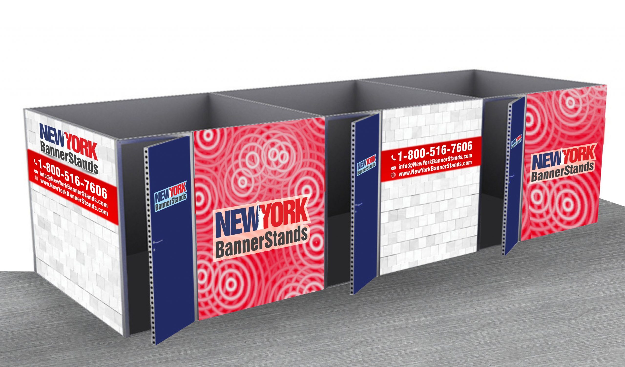 Modco Modular Display 16 is a three-dimensional 30’ x 10’ pre-designed configuration featuring three separate 10′ x 10′ exhibit rooms. Stylish and lively, these rooms are built using tool-free perforated modular aluminum frames. Multiple size frames connect using toolless pin connectors for a quick and easy build. Each rooms features a door w/ lockset and key. Perforations are completely covered for a flawless finish