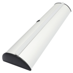 The Brumby Roll Up is our new Mid Range roll up with a half moon shaped base. Graphics attach by clamp bar on top and by double stick tape on bottom. Base is finished in anodized aluminum and black plastic end plates.