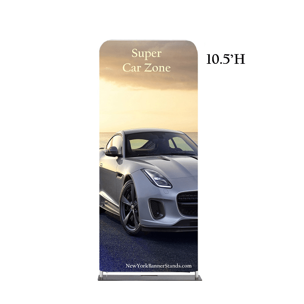 Expedite your banner stand setup time while adding lavish appeal with our newest EZ Tube fabric display the EZ Extend! Hardware comes stock at 7.5ft tall with height options of 5.5ft, 8.5ft, and 9.5ft. Customize a single-sided (choose white or black back fabric) or double-sided dye- sublimated stretch fabric print. To assemble, secure the longest vertical poles onto the black steel base using the included allen wrench. Add the bottom horizontal support pole and secure. Snap on the remaining vertical poles, then top frame with the curved bar to complete. Tilt or lay down EZ Extend to swiftly drape with the pillowcase graphic. Using the industrial-size zipper, zip underneath the support pole, maximizing fabric tension.