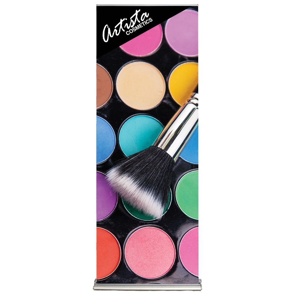 Construction: Finished in anodized aluminum and heavy duty plastic end plates. Banner attaches to the top of stand by a clamp bar (with 6″ bleed on bottom.) Graphic Materials: Super Flat Vinyl Base Size: 35″W x 9.5″D x 3″H |