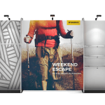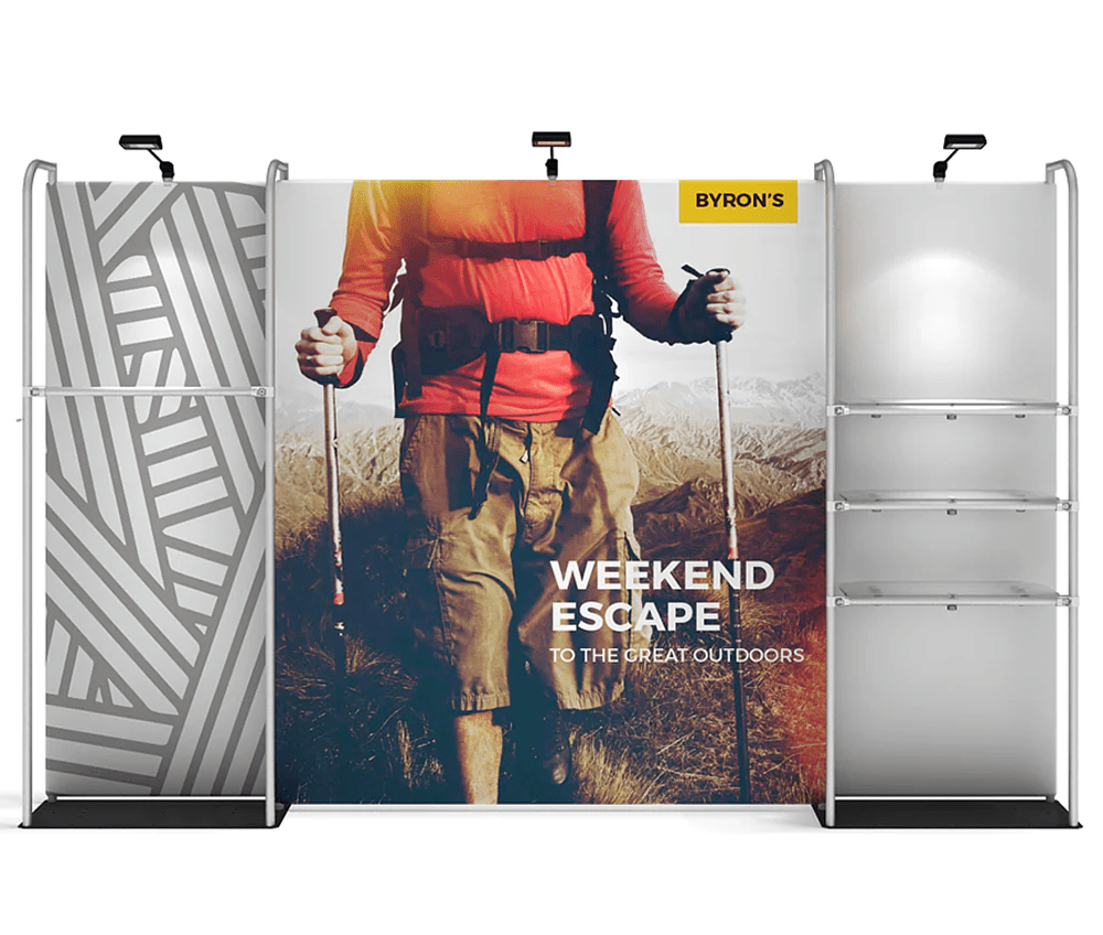 Create an instant Retail Pop-Up Store with the WaveLine® Merchandiser. Modular in design you can create multiple configurations and add-on shelves, garment bars, monitors, lights and more. Lightweight aluminum poles with bungee cord snap together to create the base framework, then slide on the pillowcase-like graphic over the frame and zip it closed at the bottom. The zipper is hidden from view and tightens up the stretched fabric graphic for a smooth image. Single or Double-sided Prints.